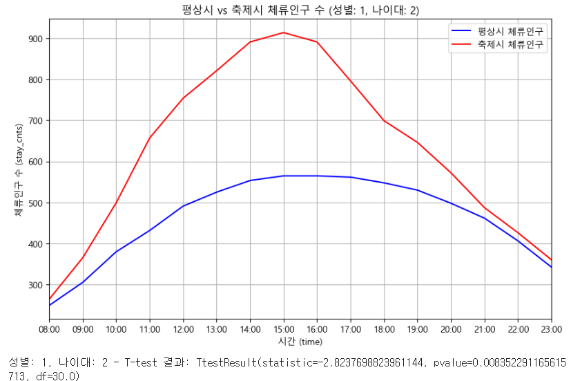 plt.title(f'평상시 vs 축제시 체류인구 수 (성별: {gender}, 나이대: {age})')
