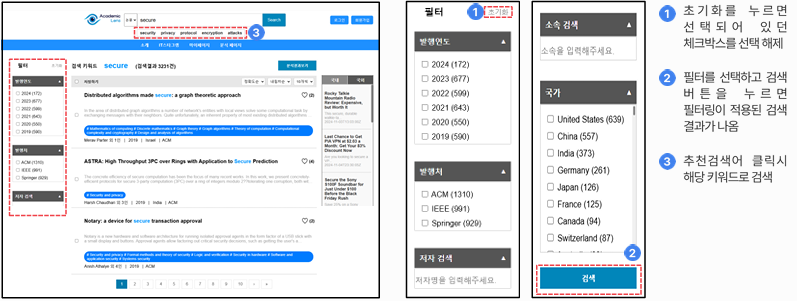 - 원하는 기간, 찾아보고 싶은 저자의 이름, 검색 키워드, 관련 키워드 등의 필터링 기능으로 사용자에게 보다 더 정확한 정보 제공